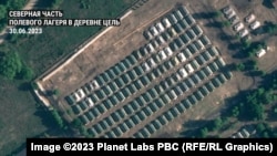 Всего журналисты белорусской службы Радио Свобода насчитали минимум 303 палатки. Все они появились на территории бывшей воинской части возле деревни Цель после 24 июня, дня мятежа вагнеровцев.