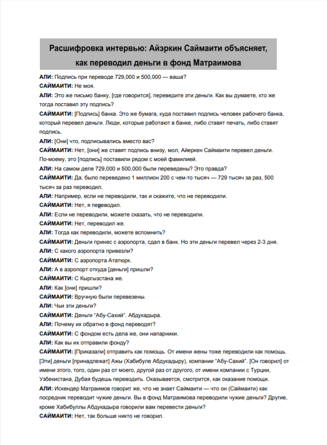 Определенно, в распоряжении Саймаити было больше документов. Перед гибелью некоторые бумаги он оставил посреднику. Среди них выписка из банка как лишнее доказательство одного из платежей в 100 тысяч долларов в адрес фонда Матраимова. Наличие у него подобного документа подтверждает, что он имел доступ к банковским данным, связанным с этими транзакциями.